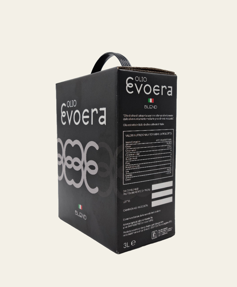 L’olio Evoera Blend, composto dalle varietà Peranzana, Rotondella e Coratina, offre un sapore fruttato medio, tendenzialmente verde, con eleganti sentori di mandorla e carciofo. Le note di amaro e piccante sono di intensità medio-leggera, rendendo questo olio perfetto per ogni tipo di piatto, dalle insalate ai piatti più cucinati. Il formato Bag in Box, con tecnologia sottovuoto, preserva la freschezza e le qualità organolettiche dell’olio nel tempo, evitando l’ossidazione. Il pratico rubinetto rende l’utilizzo quotidiano ancora più semplice e senza sprechi.