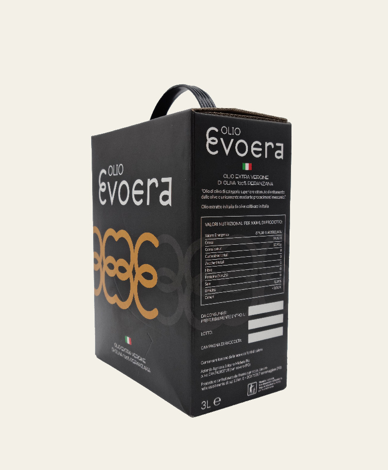 L’olio Evoera Peranzana in Bag in Box è un olio extravergine dal sapore fruttato medio, con una piacevole e delicata sensazione di amaro e piccante, perfettamente equilibrati. La varietà Peranzana è nota per il suo profilo aromatico armonioso, ideale per chi cerca un olio versatile ma sofisticato. Il formato Bag in Box, con tecnologia sottovuoto, preserva la freschezza e le qualità organolettiche dell’olio nel tempo, evitando l’ossidazione. Il pratico rubinetto rende l’utilizzo quotidiano ancora più semplice e senza sprechi.